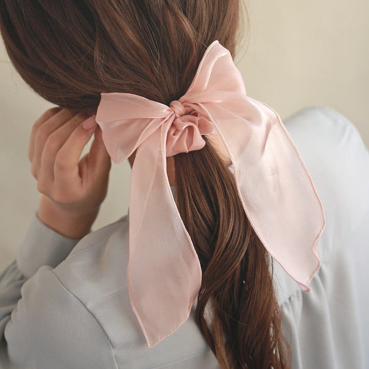 春夏的甜系風格也可以展現在髮飾上,優雅光澤的長尾蝴蝶結隨著動作飄逸,也增加了整體造型的層次感與豐富度。